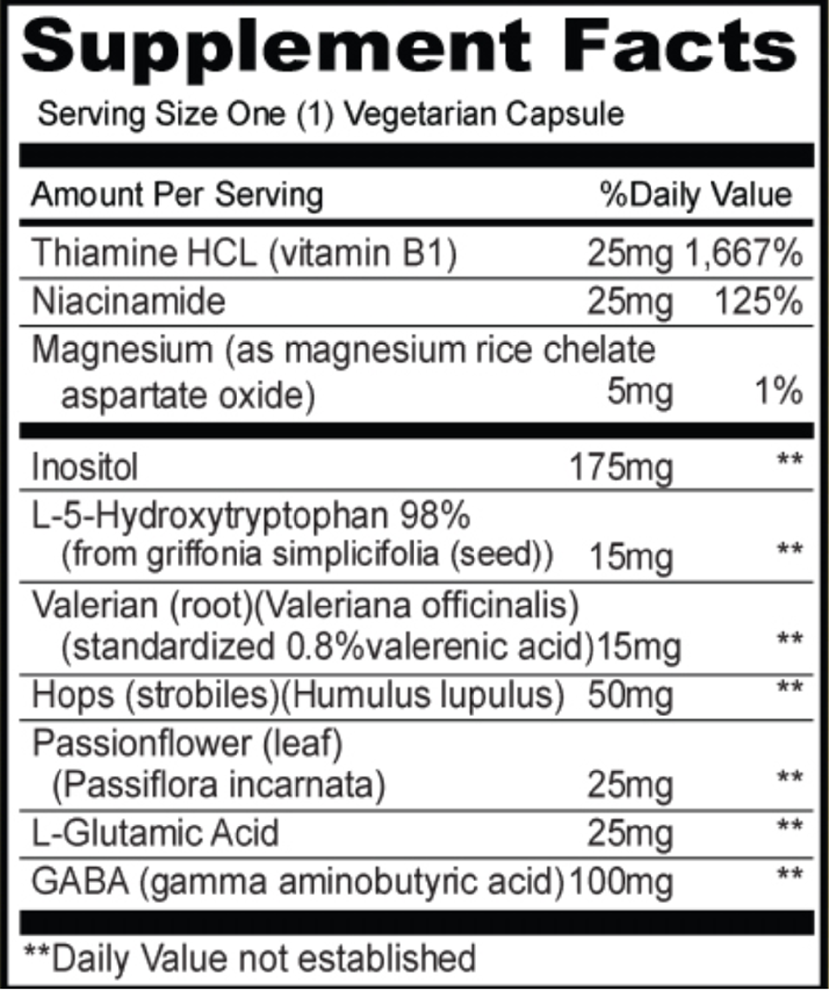 Serving Size: 1 Vegetable Capsule Servings Per Container: 90 Disclaimer Amount Per Serving Thiamine HCL (vitamin B1) 25 mg Niacinamide 25 mg Magnesium (as magnesium rice chelate oxide) 5 mg Inositol 175 mg Griffonia simplicifolia (seed) (L-5-Hydroxytryptophan 98%) 15 mg Valerian (root) (Valeriana officinalis) (standardized 0.8% valerenic acid) 15 mg Hops (strobiles)(Humulus lupulus) 50 mg Passionflower (leaf) (Passiflora incarnata) 25 mg L-Glutamic Acid 25 mg GABA (gamma amino butyric acid) 100 mg Other ingredients: Rice chelate, silicon dioxide, citric acid, vegetarian capsule (hypromellose, purified water).