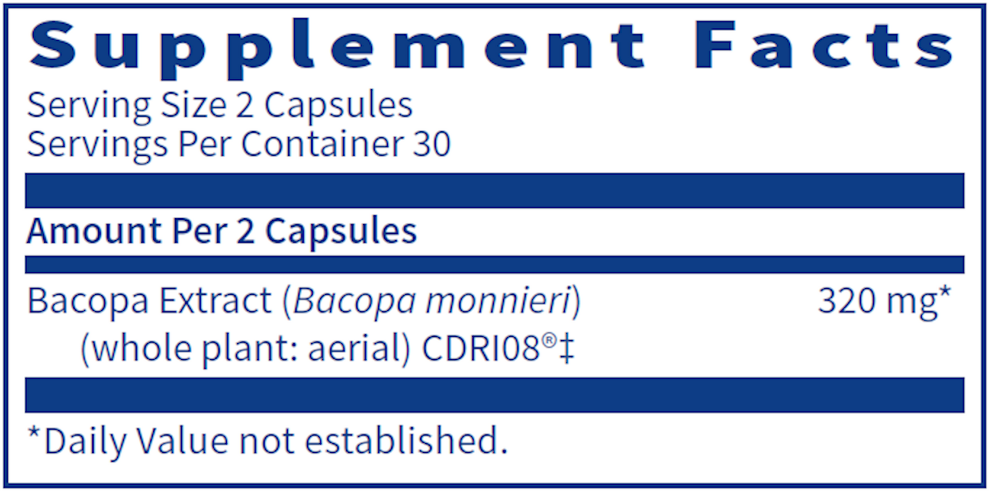 Serving Size: 2 Vegetable Capsule Servings Per Container: 30 Disclaimer Amount Per Serving Bacopa Extract (Bacopa monnieri) (whole plant: aerial) CDRI08 320 mg Other ingredients: Microcrystalline cellulose, Vegetarian capsule (hydroxypropyl methylcellulose, water), Silicon dioxide
