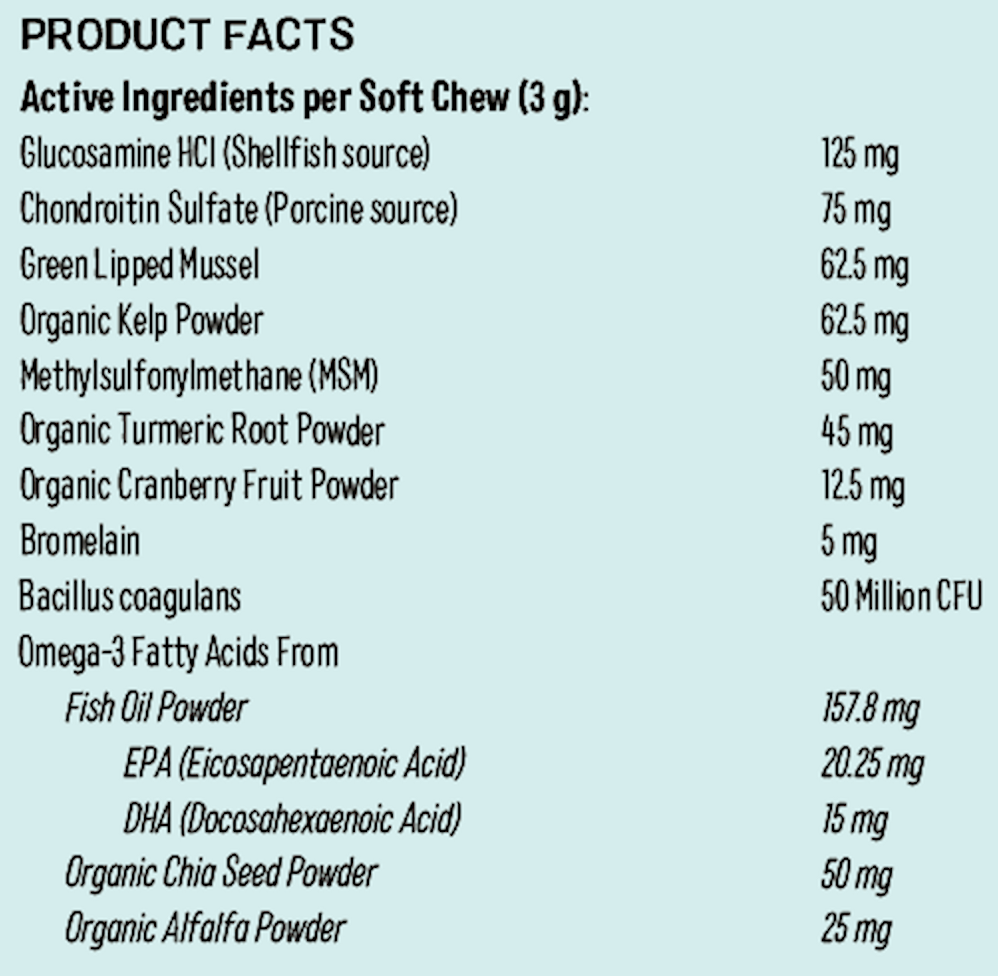 Serving Size: 1 Piece Servings Per Container: 60 Disclaimer Product Facts: Active Ingredients per Soft Chew (3 g): Glucosamine HCl (Shellfish source) 125 mg Chondroitin Sulfate (Porcine source) 75 mg Green Lipped Mussel 62.5 mg Organic Kelp Powder 62.5 mg Methylsulfonylmethane (MSM) 50 mg Organic Turmeric Root Powder 45 mg Organic Cranberry Fruit Powder 12.5 mg Bromelain 5 mg Bacillus coagulans 50 Million CFU Omega-3 Fatty Acids From: Fish Oil Powder 157.8 mg EPA (Eicosapentaenoic Acid) 20.25 mg DHA (Docosahexaenoic Acid) 15 mg Organic Chia Seed Powder 50 mg Organic Alfalfa Powder 25 mg Inactive Ingredients: Brewers Dried Yeast, Calcium Sulfate, Canola Oil, Citric Acid, Dried Potato Product, Flaxseed, Glycerin, Maltodextrin, Mixed Tocopherols, Natural Flavor Blend (Chicken Type), Rosemary Extract, Sorbic Acid, Sunflower Lecithin, Sunflower Oil, Tapioca Starch, Water.