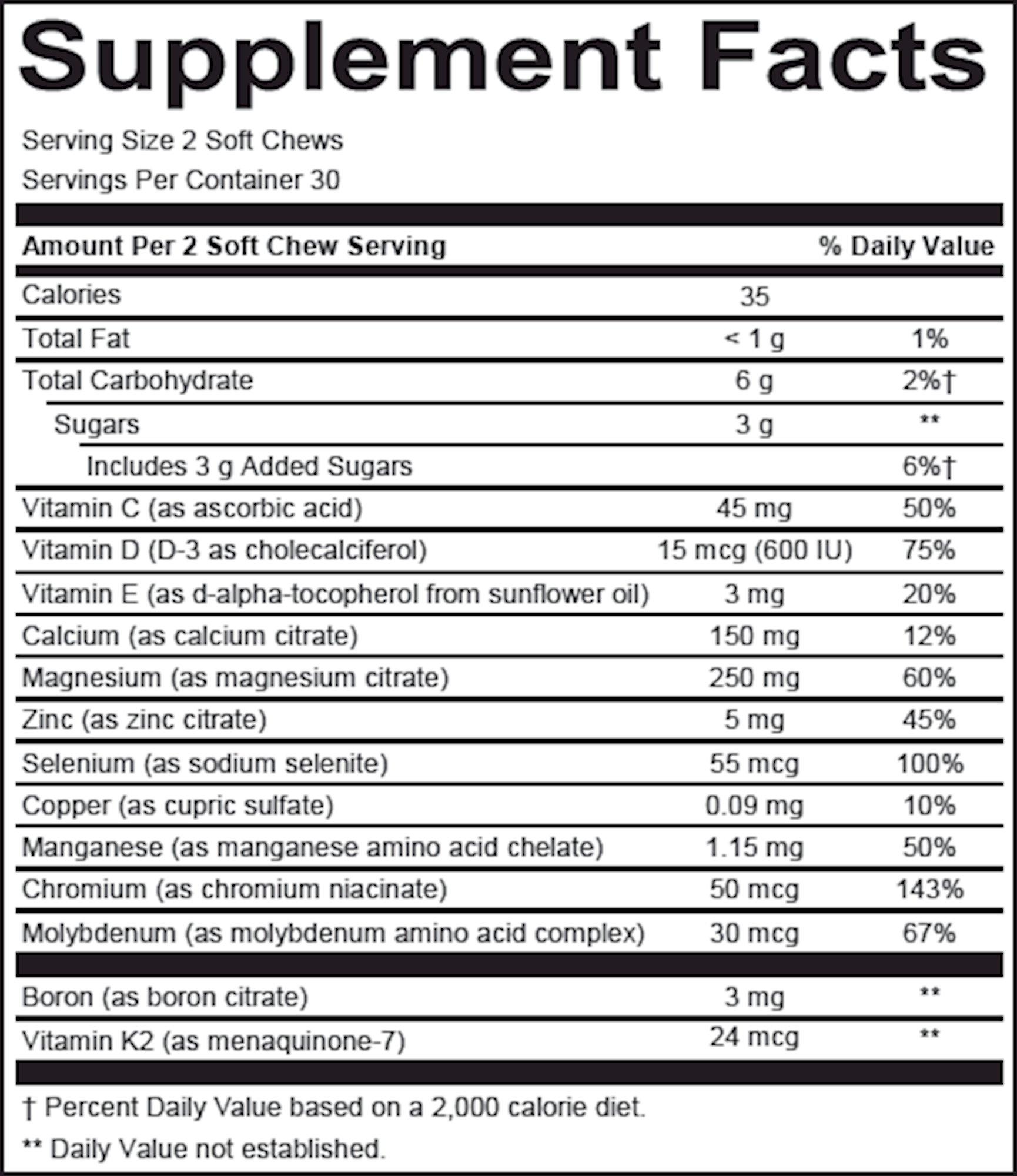 Serving Size: 2 Piece Servings Per Container: 30 Disclaimer Amount Per Serving Calories 35 Total Fat 1 g Total Carbohydrate 6 g Sugars 3 g Includes 3 g Added Sugars Vitamin C (as ascorbic acid) 45 mg Vitamin D (D-3 as cholecalciferol) (600 IU) 15 mcg Vitamin E (as d-alpha-tocopherol from sunflower oil) 3 mg Vitamin K (K-2 as menaquinone-7) 24 mcg Calcium (as calcium citrate) 150 mg Magnesium (as magnesium citrate) 250 mg Zinc (as zinc citrate) 5 mg Selenium (as sodium selenite) 55 mcg Copper (as cupric sulfate) 0.09 mg Manganese (as manganese amino acid chelate) 1.15 mg Chromium (as chromium niacinate) 50 mcg Molybdenum (as molybdenum amino acid complex) 30 mcg Boron (as boron citrate) 3 mg Other ingredients: Organic Rice Syrup, Organic Cane Sugar, Sunflower Oil, Natural Flavors, Blueberry Fruit Powder, Sunflower Lecithin, Colors Added (Blueberry Juice Concentrates), Colors Added (Black Carrot Juice Concentrates), Glycerin, Citric Acid, Stevia Leaf Extract, Vegetable Mono- and Diglycerides
