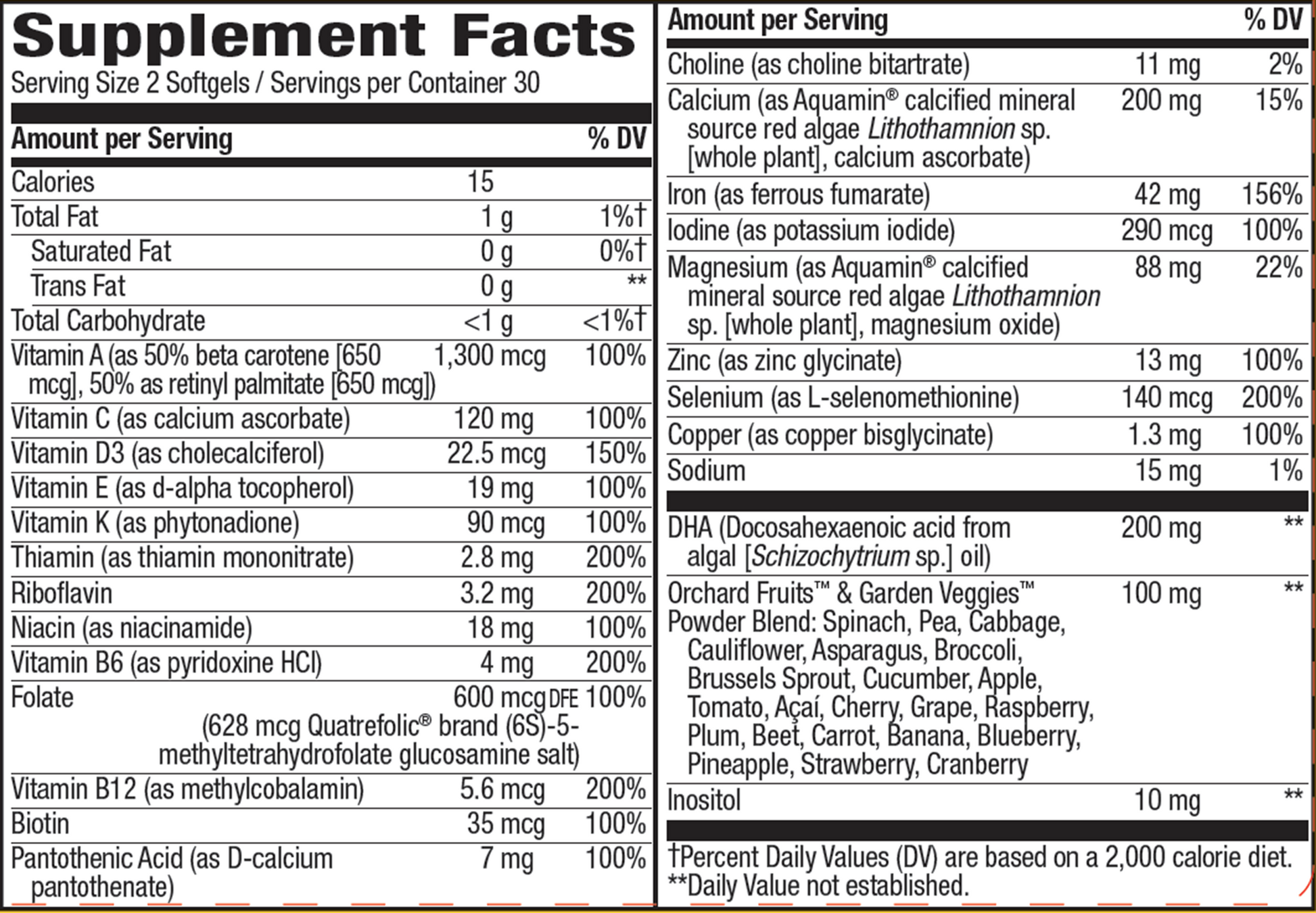 Serving Size: 2 SoftGel Servings Per Container: 30 Disclaimer Amount Per Serving Calories 15 Calories from Fat 10 Total Fat 1 g 2% Total Carbohydrate, less than 1 g Sugar Alcohol 0 g Vitamin A (50% as retinyl palmitate, 50% as beta carotene) 8000 IU 100% Vitamin A (50% as retinyl palmitate, 50% as beta carotene) Vitamin C (as calcium ascorbate) 60 mg 100% Vitamin D3 (as cholecalciferol) 600 IU 150% Vitamin E (as d-alpha tocopherol) 30 IU 100% Vitamin K1 (as phytonadione) 160 mcg 200% Vitamin B1 (as thiamin) 3.4 mg 200% Vitamin B2 (riboflavin) 4 mg 200% Vitamin B3 (as niacinamide) 20 mg 100% Vitamin B6 (as pyridoxine HCl) 5 mg 200% Folic Acid 800 mcg 100% Vitamin B12 (as methylcobalamin) 16 mcg 200% Biotin 300 mcg 100% Vitamin B5 (as d-calcium pantothenate) 10 mg 100% Calcium (as Aquamin calcified mineral source red algae Lithothamnion sp. [whole plant], calcium ascorbate) 200 mg 15% Iron (as ferrous fumarate) 28 mg 156% Iodine (as potassium iodide) 150 mcg 100% Magnesium (as magnesium oxide) 100 mg 22% Zinc (as zinc glycinate) 15 mg 100% Selenium (as L-selenomethionine) 140 mcg 200% Copper (as copper bisglycinate) 2 M 100% Sodium 10 mg 1% DHA (docosahexaenoic acid ) (Lifes DHA S40-0400 algal oil) 200 mg Orchard Fruits & Garden Veggies Powder Blend: 100 mg Spinach Pea Cabbage Cauliflower Asparagus Broccoli Brussels Sprout Cucumber Apple Tomato Aa Cherry Raspberry Grape Plum Beet Carrot Banana Blueberry Pineapple Strawberry Cranberry Choline (as choline bitartrate) 10 mg Inositol 10 mg Other ingredients: sunflower oil, modified food starch, carrageenan, glycerin, sorbitol, candelilla wax, sunflower lecithin, annatto (color), purified water, natural flavors