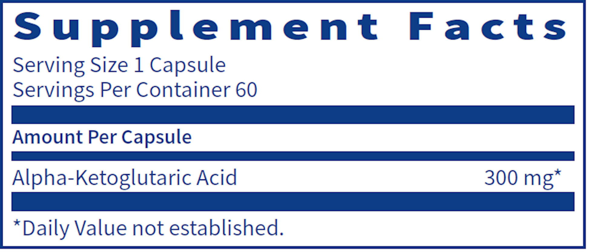 Serving Size: 1 Vegetable Capsule Servings Per Container: 60 Disclaimer Amount Per Serving Alpha-Ketoglutaric Acid 300 mg Other ingredients: Microcrystalline cellulose, vegetarian capsule (hydroxypropyl methylcellulose, water), water, ascorbyl palmitate.