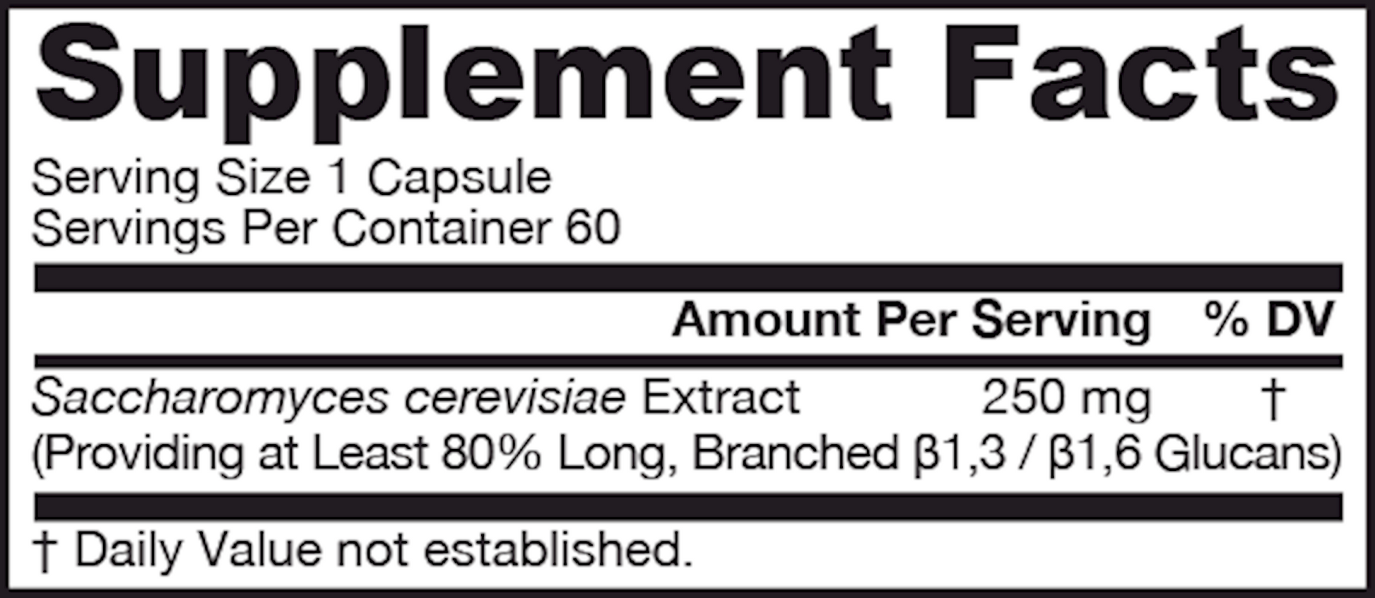 Serving Size: 1 Capsule Servings Per Container: 60 Disclaimer Amount Per Serving Saccharomyces cerevisiae extract (providing at least 80% long,branched 1,3 / 1,6 glucans) * 250 mg Other ingredients: Cellulose, magnesium stearate (vegetable source), silicon dioxide, Capsule consists of gelatin