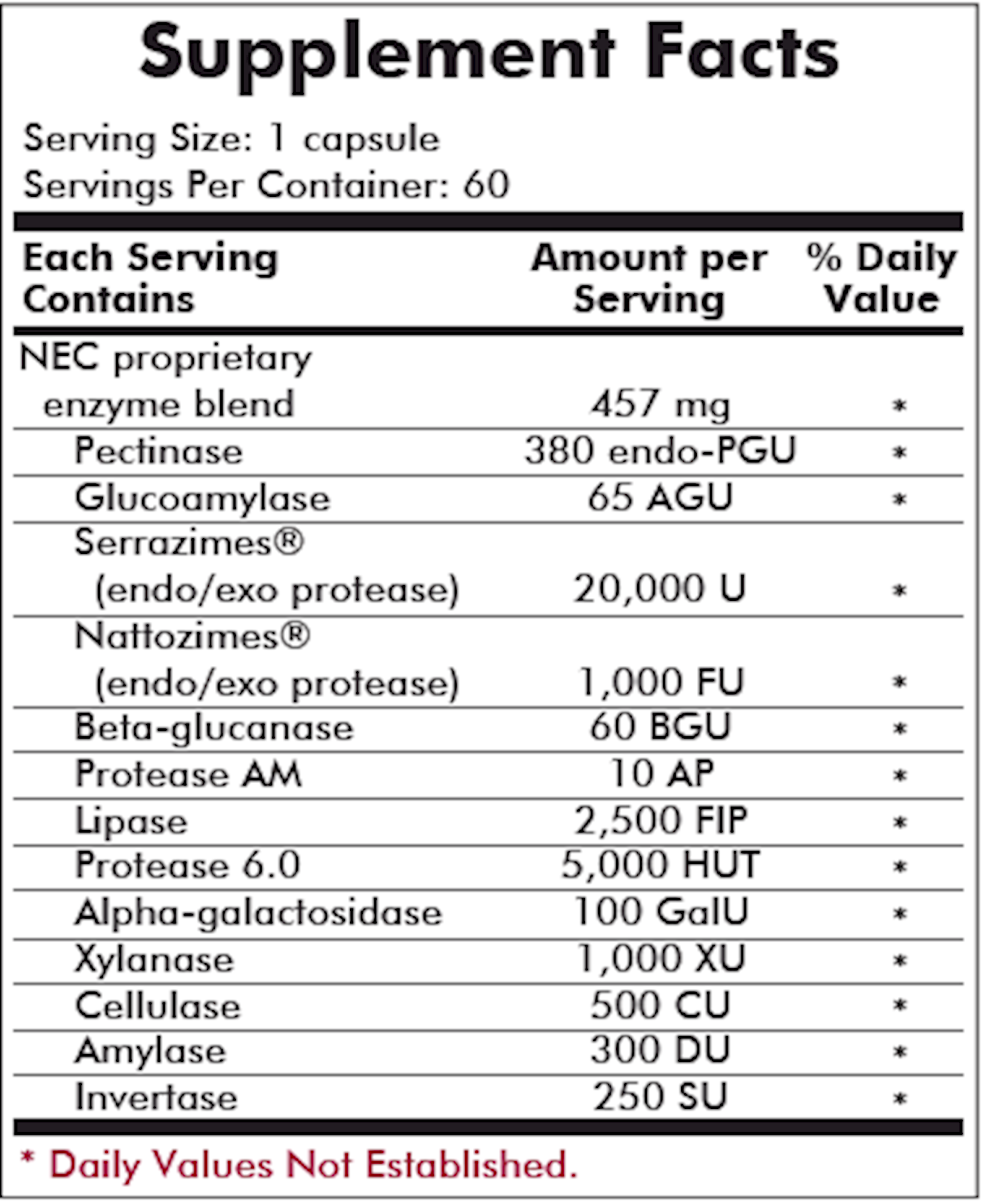 Serving Size: 1 Capsule Servings Per Container: 60 Disclaimer Amount Per Serving Kirkman proprietary biofilm enzyme blend: 442 mg Pectinase 400 endo-PGU Glucoamylase 30 AGU Serrapeptase (endo/exo protease) 9500 Use Nattokinase (endo/exo protease) 200 FU Beta-glucanase 60 BGU Protease AM 10 LAPU Lipase 500 FIP Protease 6.0 3000 HUT Alpha-galactosidase 100 GaIU Xylanase 200 XU Cellulase 500 CU Amylase 300 DU Invertase 250 SuggestedHemicellulase 100 HUT Other ingredients: Vegetable cellulose, purified water, rice extract and hulls, gum arabic, sunflower oil