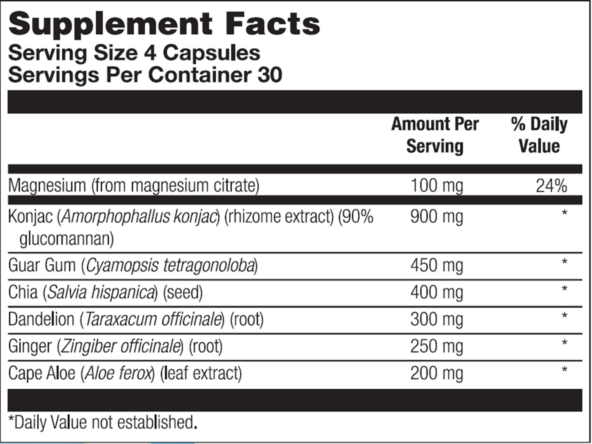 Serving Size: 4 Capsule Servings Per Container: 30 Disclaimer Amount Per Serving Magnesium (from magnesium citrate) 100 mg Konjac (Amorphophallus konjac, (rhizome extract) (90% glucomannan) 900 mg Guar Gum (Cyamopsis tetragonoloba) 450 mg Chia seed (Salvia hispanica) (seed) 400 mg Dandelion (Taraxacum officinale) (root) 300 mg Ginger (Zingiber officinale) (root extract) 250 mg Cape Aloe (Aloe ferax) (leaf extract) 200 mg Other ingredients: Vegetable cellulose capsule, ascorbyl palmitate, cellulose, silica