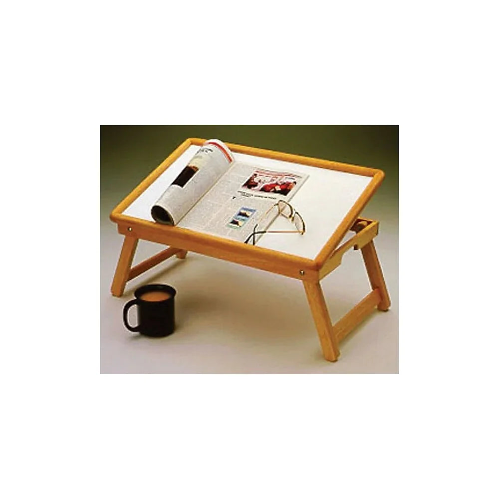 - The bed tray with adjustable surface is made with a solid wood frame in natural finish and a white melamine top