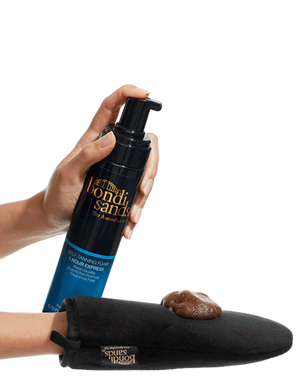 Step 2: Pump foam applicator firmly. Apply Bondi Sands Self Tanning Foam liberally to a Bondi Sands Application Mitt. Use a long, sweeping motion to apply to legs, arms and body. Use remaining residue on mitt to apply to face, elbows and knees.