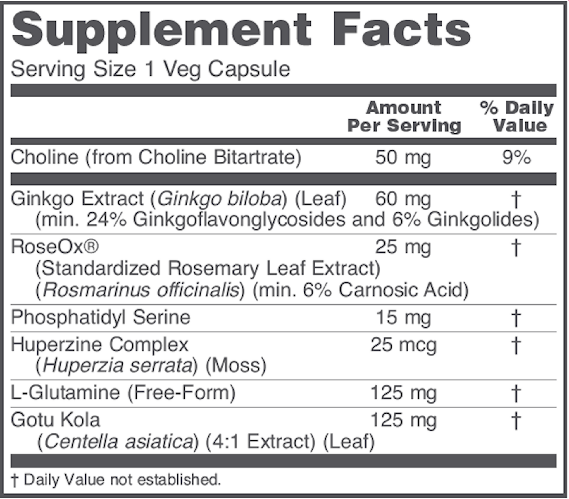 Serving Size: 1 Vegetable Capsule Servings Per Container: 90 Disclaimer Amount Per Serving Ginkgo Biloba Extract (min. 24% Flavonglycosides and min. 6% Terpene Lactones including Ginkgolides B) 60 mg RoseOx (Standardized Rosemary Leaf Extract) (min. 6% Carnosic Acid) 25 mg Leci-PS Phosphatidyl Serine 15 mg Huperzine A (Huperzia serrata) (Moss) 25 mcg L-Glutamine (Free-Form) 125 mg Gotu Kola (Centella asiatica) (4:1 Extract) (Leaf) 125 mg Choline (from Choline Bitartrate) 50 mg Other ingredients: Cellulose (capsule), Magnesium Stearate (vegetable source), Rice Flour, Silica