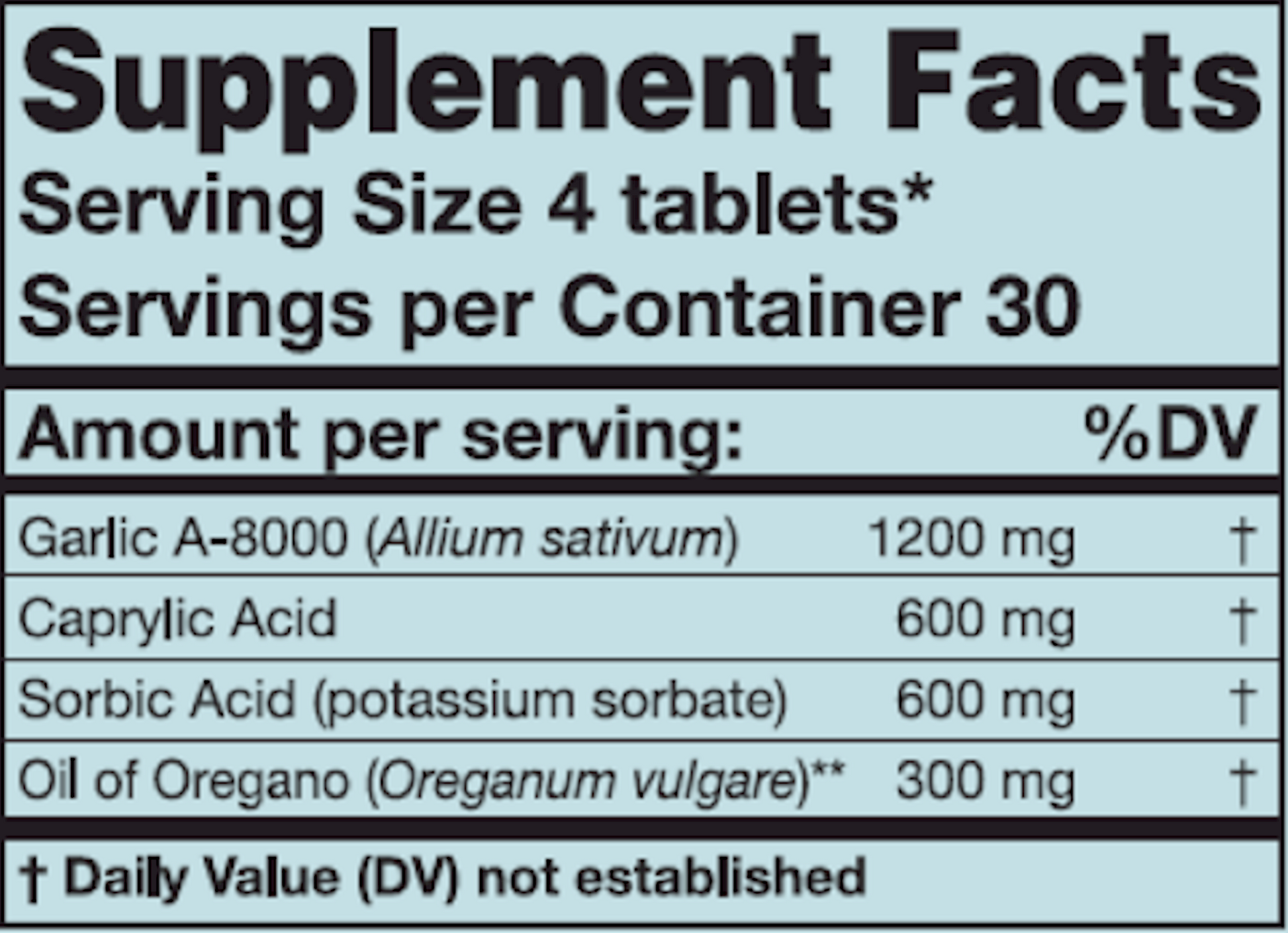 Serving Size: 4 Tablet Disclaimer Amount Per Serving Oregano Oil 4:1 extract yielding 2% essential oils 400 mg Odorless Aged Garlic (allium sativum) 1200 mg Caprylic Acid 600 mg Sorbic Acid (potassium sorbate) 600 mg Other ingredients: