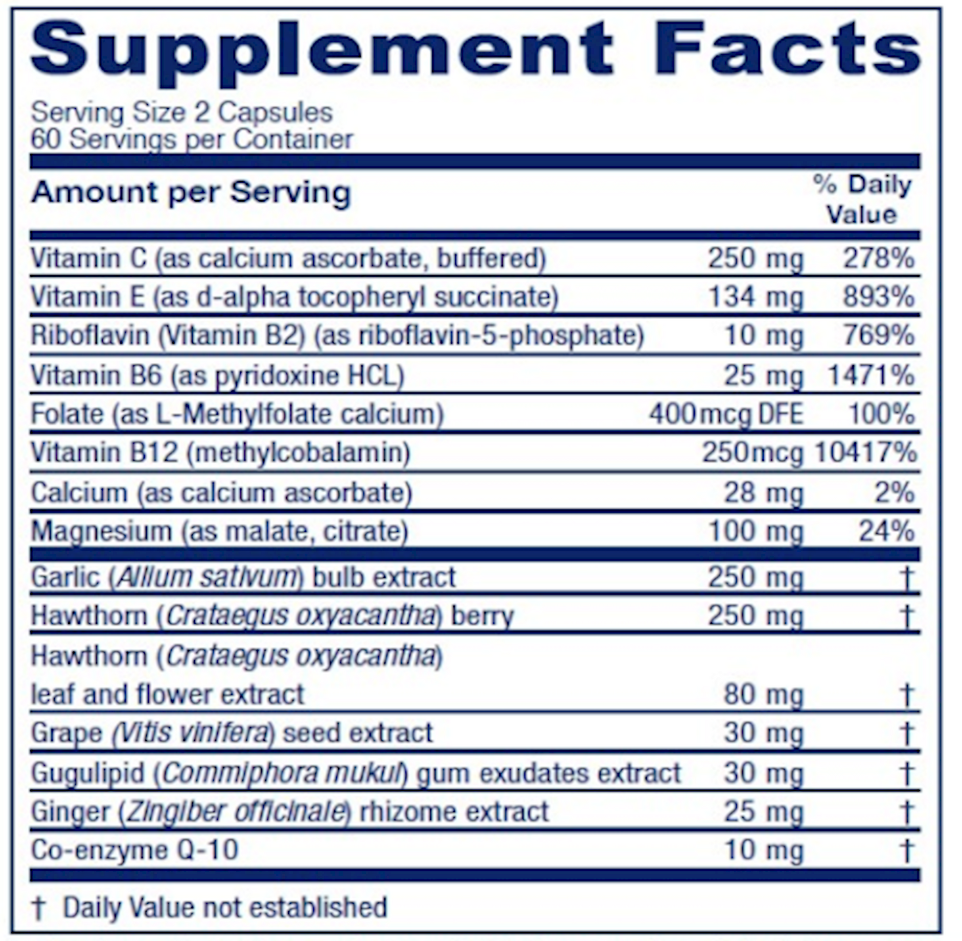 Serving Size: 2 Capsule Servings Per Container: 60 Disclaimer Amount Per Serving Vitamin C (as calcium ascorbate, buffered)) 250 mg Vitamin E (as d-alpha succinate) 200 IU Riboflavin (as Vitamin B2, as riboflavin-5-phosphate) 10 mg Vitamin B6 (as pyridoxine HCL) 25 mg Folate (as L-5-Methylfolate) 400 mcg Vitamin B12 (methylcobalamin) 250 mcg Magnesium (as citrate, malate) 100 mg Garlic extract ~ Allium sativum 250 mg Hawthorn berry ~ Crataegus oxyacantha 250 mg Hawthorn leaf and flower extract ~ Crataegus oxyacantha 800 mg Grape seed extract ~ Vitus vinifera 30 mg Ginger root extract ~ Zingiber officinale 25 mg Guggulipid extract ~ Commiphora mukul 30 mg Co-enzyme Q-10 10 mg Other ingredients: vegetarian capsule (cellulose and water), silicon dioxide, l-leucine
