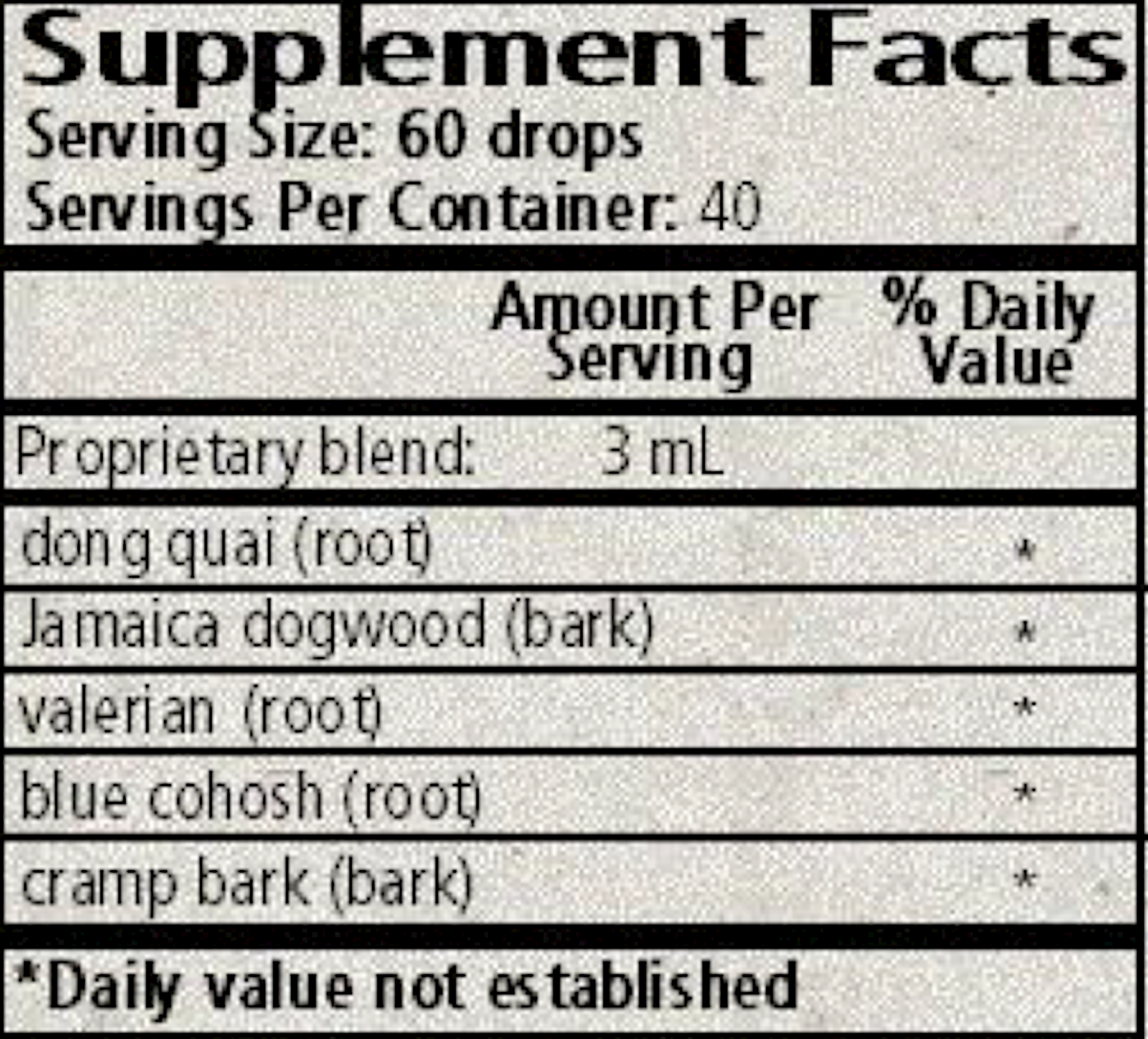 Ingredients: Wildcrafted Dry Root of Dong quai Wildcrafted Dry Bark of Jamaican Dogwood Organic fresh root of Valeriana Wildcrafted Cramp Bark Wildcrafted dry root of Blue Cohosh Pure Grain Alcohol: 60%