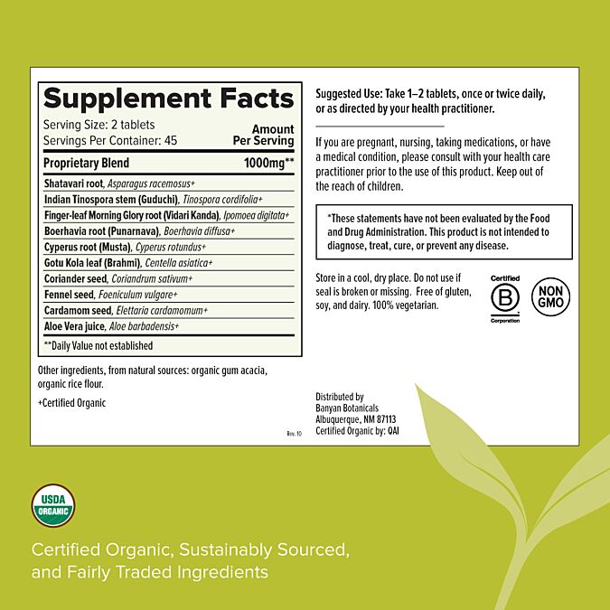 Serving Size: 1 Tablet Servings Per Container: 90 Disclaimer Amount Per Serving Proprietary Blend Shatavari root, Asparagus racemosus+ Indian Tinospora stem (Guduchi), Tinospora cordifolia+ Finger-leaf Morning Glory root (Vidari Kanda) Ipomoea digitata+ Boerhaavia root (Punarnava), Boerhaavia diffusa+ Cyperus root (Musta), Cyperus rotundus+ Gotu Kola leaf (Brahmi), Centella asiatica+ Coriander seed, Coriandrum sativum+ Fennel seed, Foeniculum vulgare+ Cardamom seed, Elettaria cardamomum+ Aloe Vera juice, Aloe barbadensis+ Other ingredients: organic maltodextrin, organic gum arabic, organic rice flour