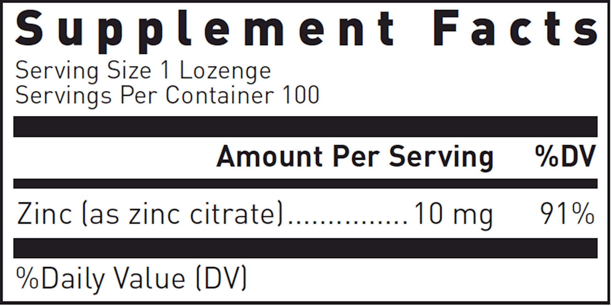 Serving Size: 1 Lozenge Servings Per Container: 100 Disclaimer Amount Per Serving Zinc (from zinc citrate) 10 mg Other ingredients: Sorbitol, citric acid, natural orange flavor, vegetable stearate